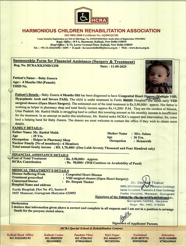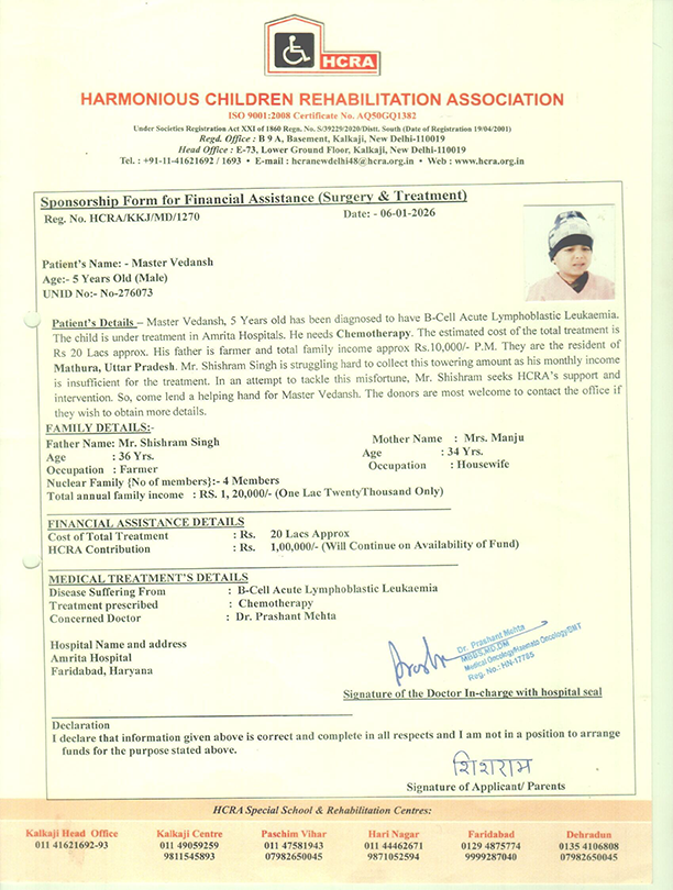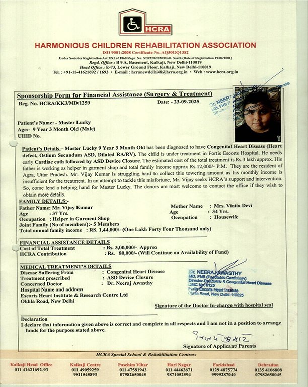 HCRA offers financial assistance to children (up to 20 years old) from economically disadvantaged backgrounds for conditions such as heart disease, cancer, orthopedic issues, and other life-threatening illnesses. This support encompasses a range of services, including free diagnosis, laboratory tests, surgeries, medications, and necessary aids and appliances. To date, HCRA has facilitated successful operations for over 1000 patients through its initiatives.