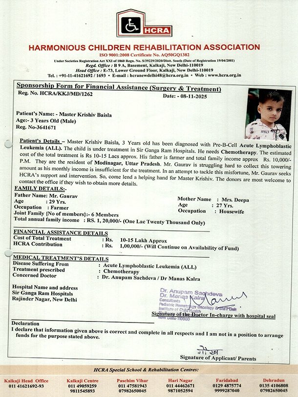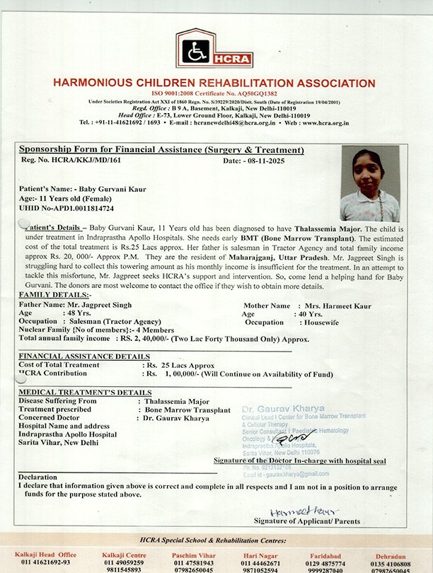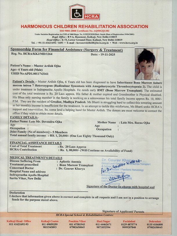 Master Hunny Sharma, 12 Years old has been diagnosed to have Thalassemia Major. The child is under treatment in Indraprastha Apollo Hospitals. He needs early BMT (Bone Marrow Transplant)